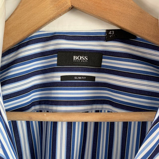 Boss Hugo Boss Blue and White striped Shirt Size Large 43/17 Neck