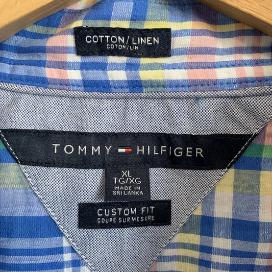 Tommy Hilfiger Custom Fit Cotton / Linen Mix Pink Blue Check Shirt Size XL