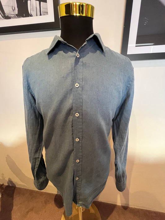 Boss Hugo Boss 100% Cotton Linen Blue Shirt Size Large Slim Fit