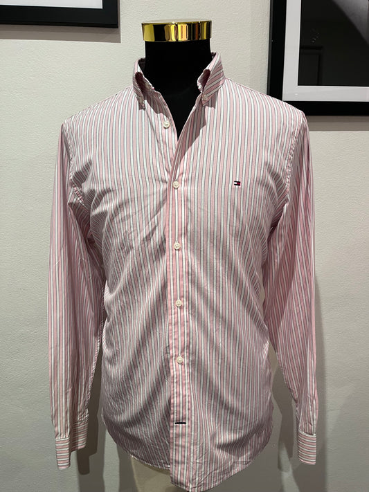 Tommy Hilfiger Regular Fit 100% Cotton Pink White Stripe Shirt Size Large