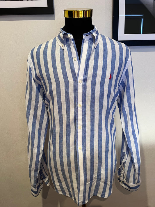 Ralph Lauren Blue / White Stripe 100% Linen Cotton Size Large Slim Fit