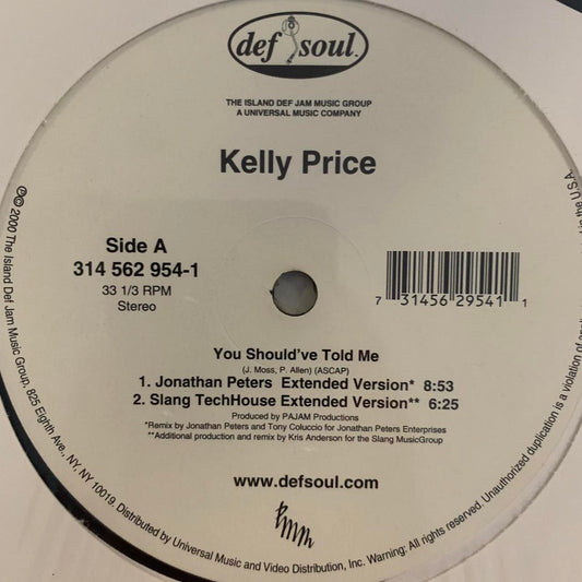 Kelly Price “You Should’ve Told Me” 4 Version 12inch Vinyl, Featuring Jonathan Peter's Extended Version, Slang TechHouse Extended Version and Instrumentals