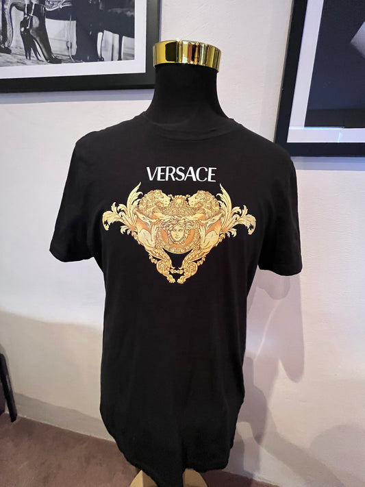 Versace 100% Cotton Black Tee Gold Print Logo Size XL Made in Italy
