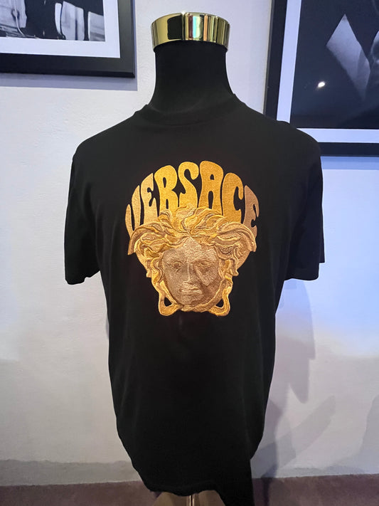 Versace 100% Cotton Black Tee Gold Embroidered Logo Size XL Made in Italy