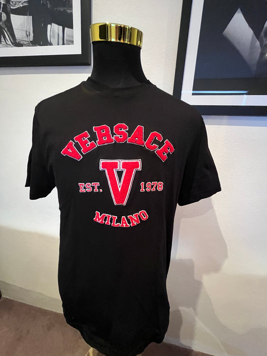 Versace 100% Cotton Black Tee Red Embroidered Logo Size XL Made in Italy